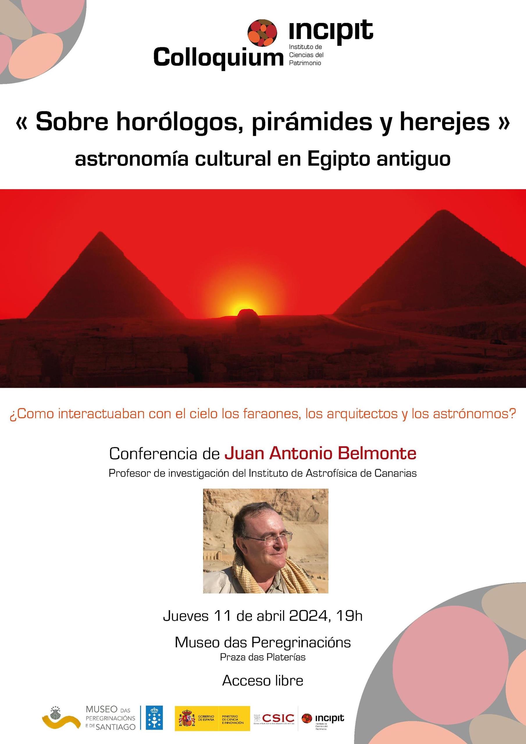 El próximo Colloquium-Incipit nos ofrecerá un profundo viaje en el espacio-tiempo del Egipto antiguo, con una charla titulada "Sobre horólogos, pirámides y herejes".Nuestro invitado, Juan Antonio Belmonte, nos mostrará que el cielo jugó un papel muy relevante en la cultura del País de la Tierra Negra, Egipto. A partir de tres ensayos, nos explicará cómo interactuaban con el cielo tres clases de personajes: a) los astrónomos, encargados de controlar el tiempo y dictar el calendario, b) los arquitectos que diseñaron enormes monumentos donde el paisaje y el celaje se integraban de forma singular, y c) los mismos faraones, encargados de mantener el orden cósmico, la Ma'at, aunque algunos siguieran caminos heterodoxos.¡Este viaje recorrerá casi tres mil años a lo largo del tiempo y el espacio, y no defraudará!Sobre Juan Antonio Belmonte: Profesor de Investigación del Instituto de Astrofísica de Canarias, es uno de los pioneros de la arqueoastronomía en España y una figura de reconocido prestigio a nivel internacional. Durante más de una década, fue uno de los investigadores principales de la misión Hispano-Egipcia de Arqueoastronomía, logrando estudiar las orientaciones de la gran mayoría de templos y estructuras funerarias del Egipto Antiguo en diversas campañas de trabajo de campo in situ. Es coautor, con el egiptólogo Jose Lull, del libro "Astronomy in ancient Egypt: a cultural perspective”, donde recorren lo que a día de hoy conocemos y desconocemos sobre cómo el cielo era una parte fundamental de la cultura del país de los Faraones.